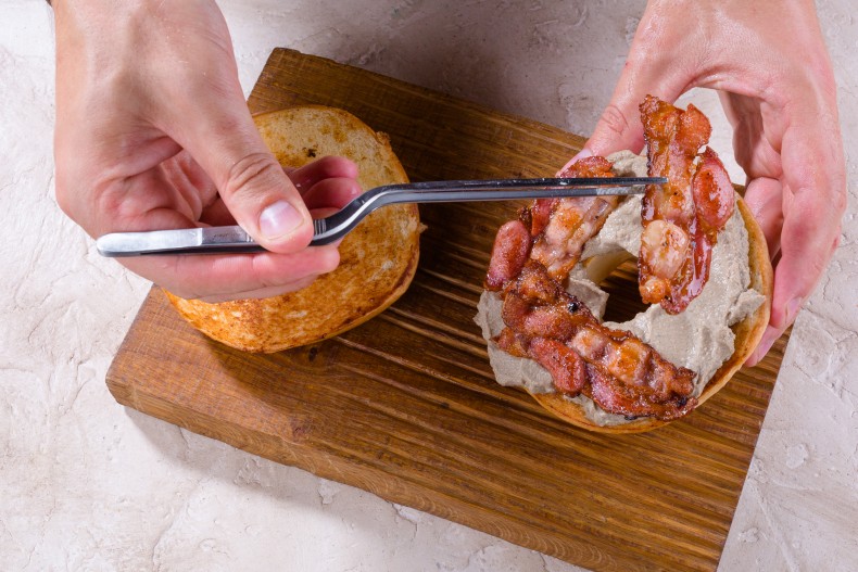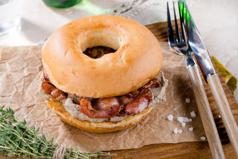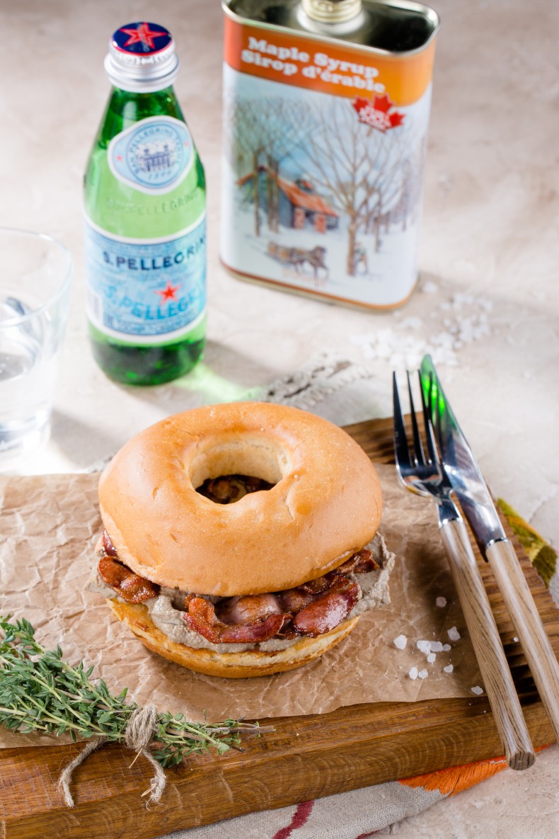 Национальная гордость Канады – это, конечно, кленовый сироп. Другая гордость – булочка бейгл, которая сначала отваривается, затем румянится в духовке. Сочетание этих продуктов может получиться ярким и необычным: разрезанный пополам бейгл с беконом в кленовом сиропе.