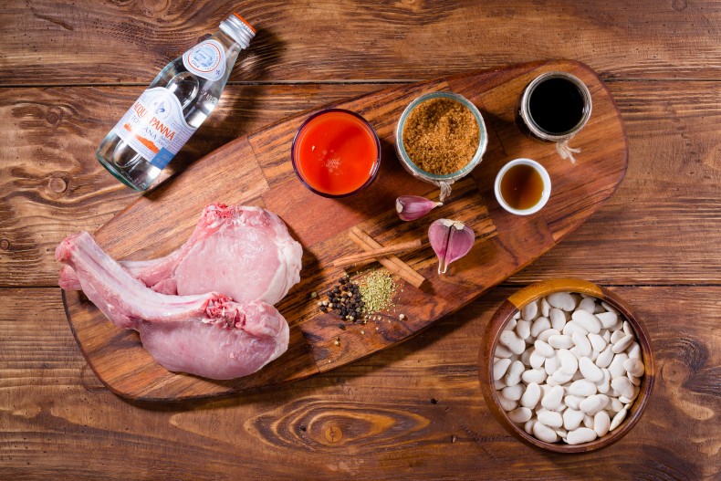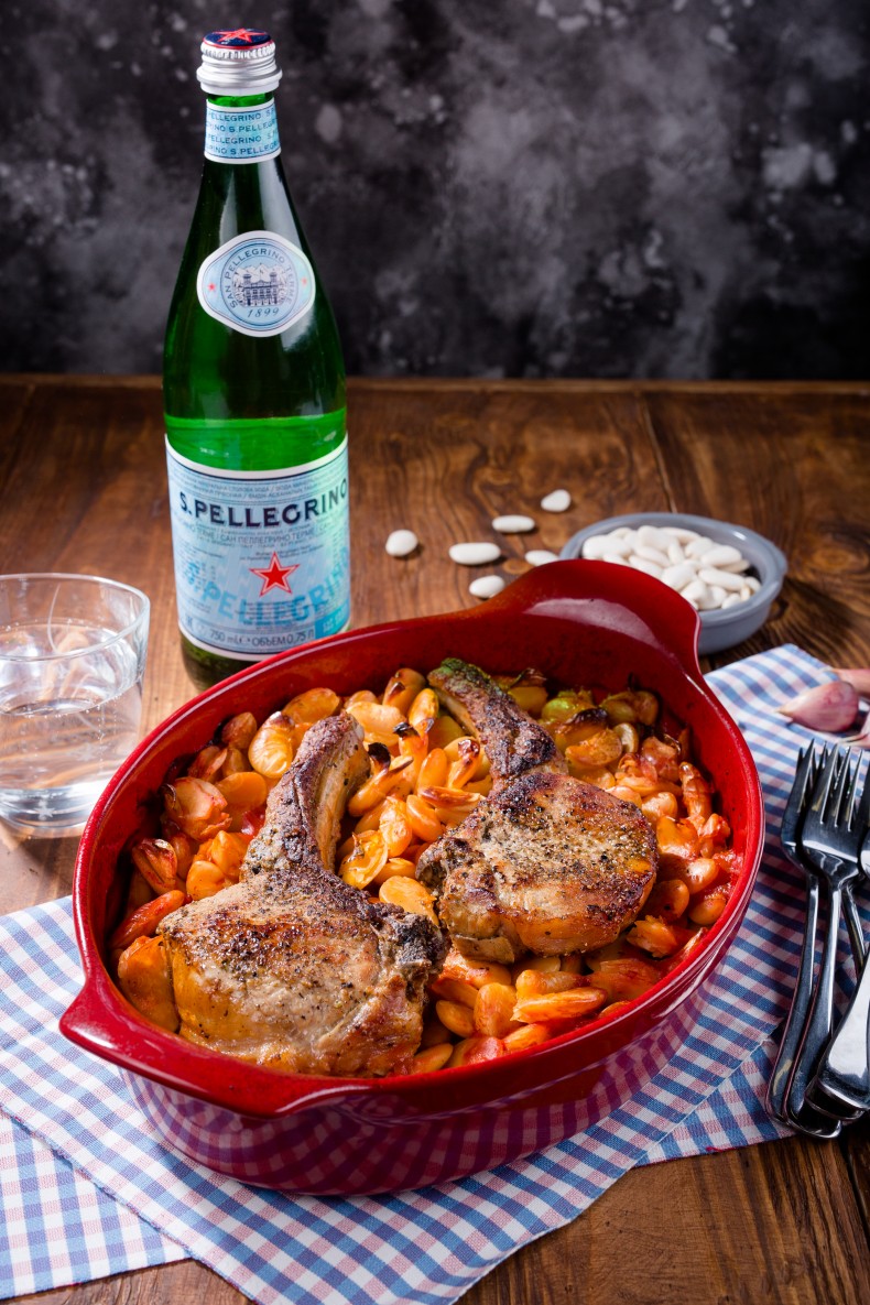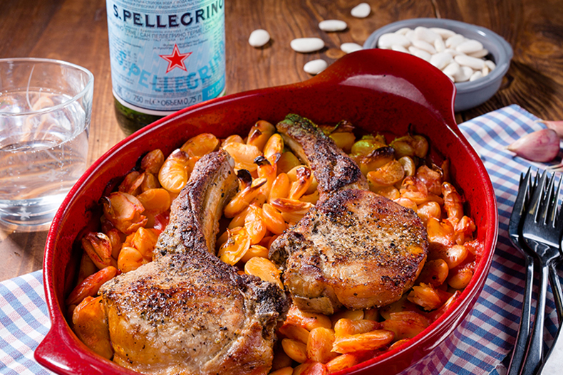 Стейк из свинины на кости и запеченная красная фасоль в томатах